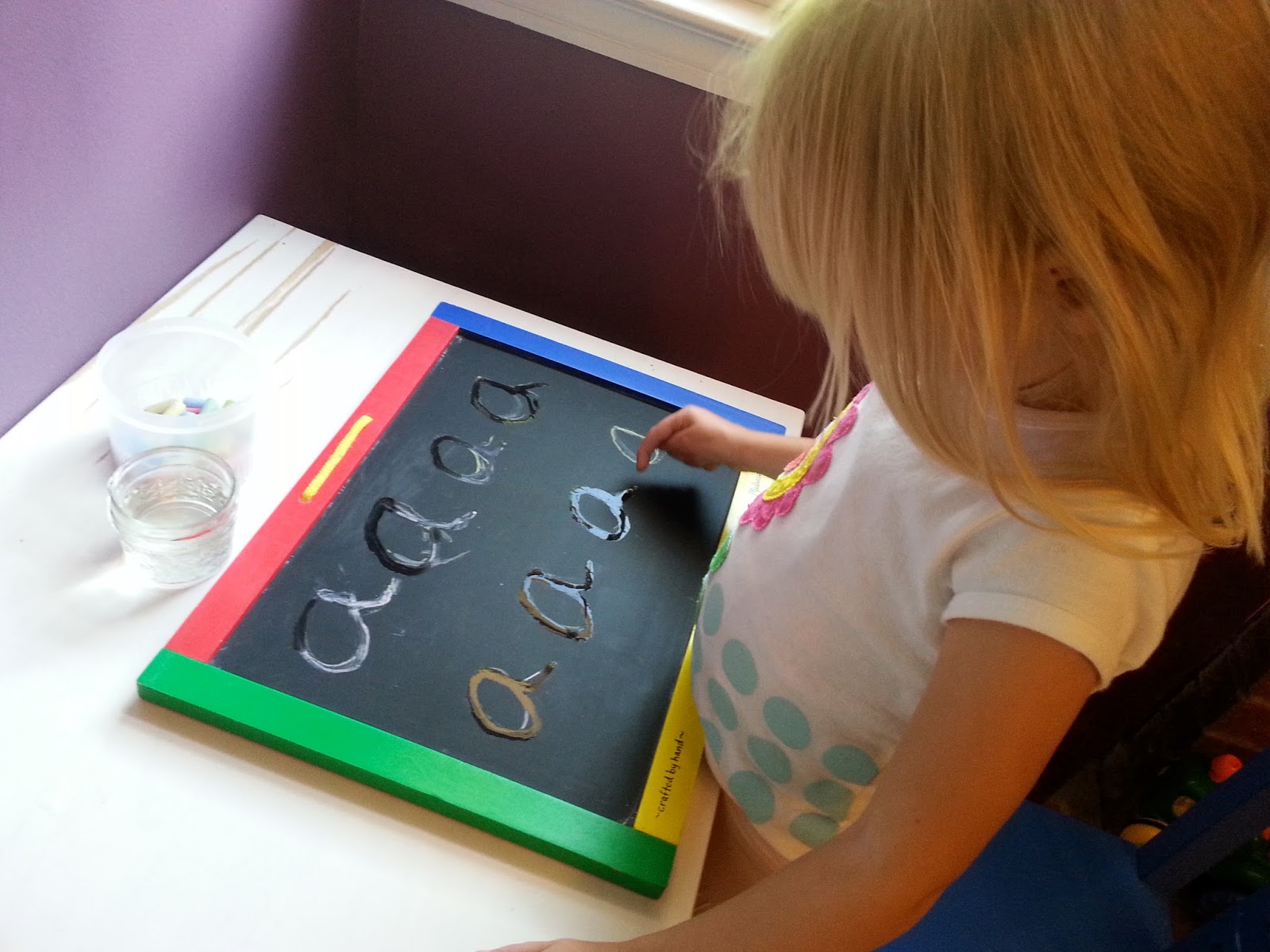 Friday we had an appointment we had to attend so we skip lessons that morning. We did some review that afternoon with a combination of Montessori, using the wet, dry, try method on the chalkboard and then we used some worksheets from the new curriculum to practice the lowercase "a."